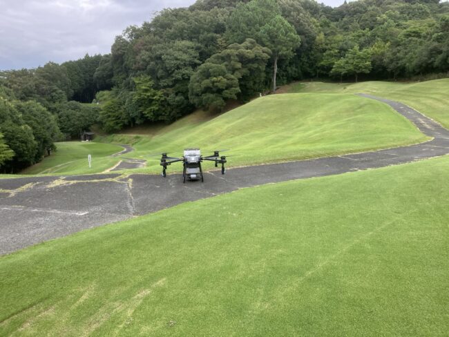 2025年10月、愛知県のゴルフ場にて肥料散布を行いました。ゴルフ場のコースは起伏があるところが多く、スプレイヤーが入りづらい場所があるため、ドローンの自動飛行を活用した実証試験を行いました。