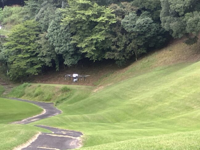 使用機体はDJI T25、ラフへの散布を自動で行いましたが、隅などは一部手動で散布することでムラを減らしました。