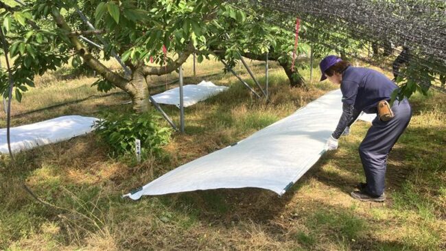 タイベックは果樹の着色促進に欠かせない「白い反射シート」です。通常は100m巻で販売されますが、設置や片付けに手間がかかるのが難点でした。