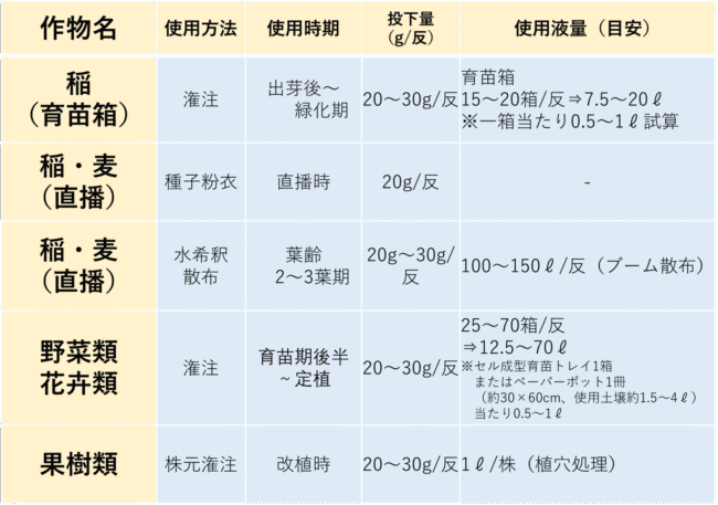 種子粉衣や苗への潅注処理が特に効果的。生育初期に根へ定着させることで高い効果が得られます。
