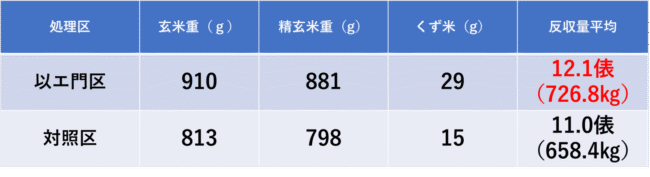 初期生育から草丈・茎数・穂数に差が出た状態で刈取りを行えた為、対照区と比べて反収量が110.3%増加。