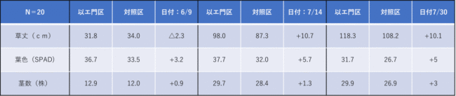 田植え後1ヶ月目は対照区がやや優位でしたが、2ヶ月目以降は以エ門区が明らかに生育で上回りました。