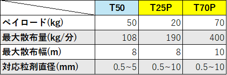 従来の最大ドローンであるAGRAS T50と比較すると、どちらも最大散布量が増加、対応粒剤直径幅が拡大しています。