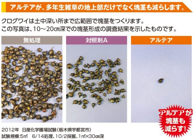 除草成分 アルテアにより、多年生雑草の 地上部だけでなく塊茎形成も抑制。